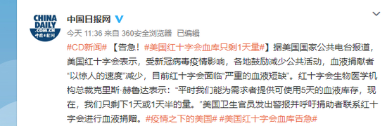 据美国国家公共电台报道,美国红十字会表示,受新冠病毒疫情影响,各地鼓励减少公共活动,血液捐献者“以惊人的速度”减少,目前红十字会面临“严重的血液短缺”。红十字会生物医学机构总裁克里斯·赫鲁达表示:“平时我们能为需求者提供可使用5天的血液库存,现在,我们只剩下1天或1天半的量。”美国卫生官员发出警报并呼吁捐助者联系红十字会进行血液捐赠。