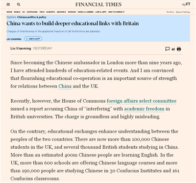 11月26日,英国主流大报《金融时报》在纸质版和网络版同时刊登刘晓明大使署名文章《中英应当深化人文教育交流》,刘晓明表示,该报告捕风捉影,充满偏见,误导公众,近年来中英教育交流合作的蓬勃开展,为两国关系不断注入动力。