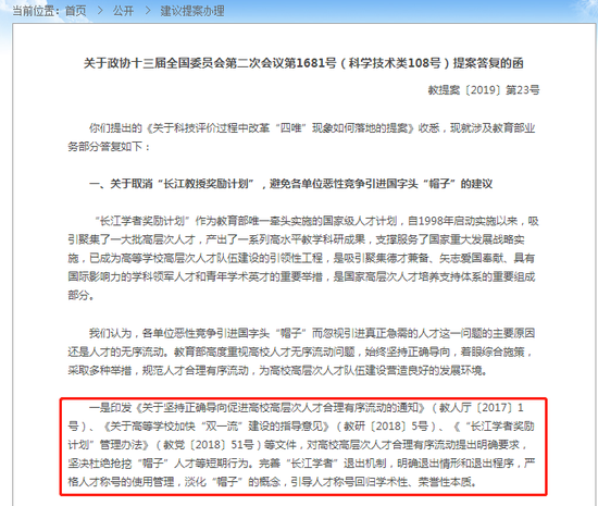 针对政协提案中,关于取消“长江教授奖励计划”的建议,近日,教育部回复称,今后要完善“长江学者”退出机制,明确退出情形和退出程序,淡化“帽子”的概念。一年前公布的《“长江学者奖励计划”管理办法》已明确,要建立“长江学者奖励计划”退出机制,如有违反政治纪律和政治规矩、弄虚作假骗取入选资格的、严重违反师德师风等八类情形,应当退出。