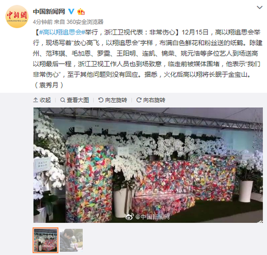 12月15日,高以翔追思会举行,现场写着“放心高飞,以翔追思会”字样,布满白色鲜花和粉丝送的纸鹤。陈建州、范玮琪、毛加恩、罗雯、王阳明、连凯、锦荣、姚元浩等多位艺人到场送高以翔最后一程,浙江卫视工作人员也到场致意,临走前被媒体围堵,他表示“我们非常伤心”,至于其他问题则没有回应。据悉,火化后高以翔将长眠于金宝山。(袁秀月)