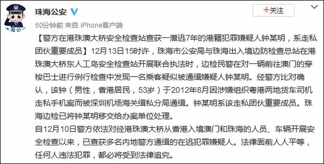 在16日的通报中,珠海警方同时透露,自12月10日警方依法对经港珠澳大桥从香港入境澳门和珠海的人员、车辆开展安全检查以来,已查获多名内地警方通缉的在逃犯罪嫌疑人。法律面前人人平等,任何人违法犯罪,都必将受到法律追究。