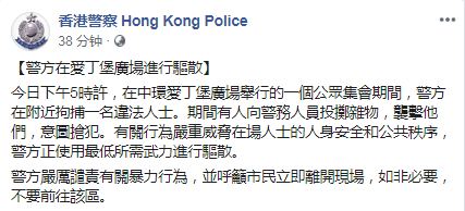 香港警方22日下午17时37分在脸书发文表示,今日下午17时许,在中环爱丁堡广场举行的一个公众集会期间,警方于附近拘捕一名违法人士。期间有人向警务人员投掷杂物,袭击他们,意图抢犯。有关行为严重威胁在场人士的人身安全和公共秩序,警方正使用最低所需武力进行驱散。警方严厉谴责有关暴力行为,并呼吁市民立即离开现场,如非必要,不要前往该区。