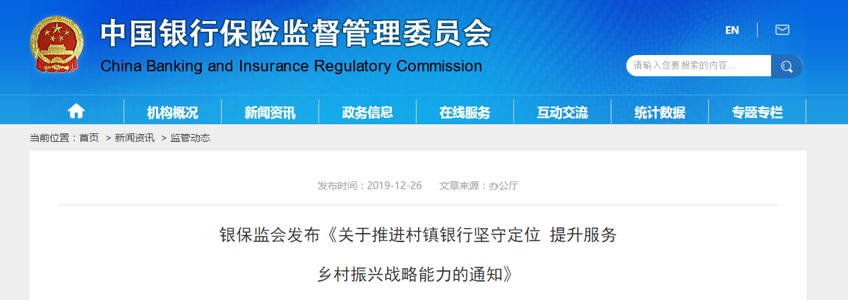 新京报讯 12月26日,银保监会发布了《关于推进村镇银行坚守定位提升服务乡村振兴战略能力的通知》(以下简称《通知》),以贯彻落实党的十九大提出实施乡村振兴战略、第五次全国金融工作会议要求中小银行回归本源、专注主业相关精神,推进村镇银行更好地坚守支农支小市场定位、专注信贷主业,切实增强服务乡村振兴战略能力。