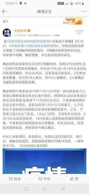 2月16日,河南省信阳新县通报了2例新冠肺炎确诊病例的情况:2例确诊病例潜伏时间长、传染源不明确、确诊困难,并且具有较强传染性。