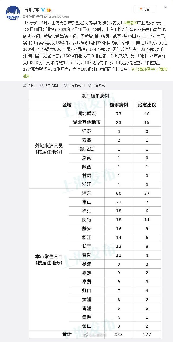 市卫健委今天(2月18日)通报:2020年2月18日0—12时,上海市排除新型冠状病毒肺炎疑似病例22例;新增治愈出院16例;无新增确诊病例。截至2月18日12时,上海市已累计排除疑似病例1854例,发现确诊病例333例。确诊病例中,男性173例,女性160例;年龄最大88岁,最小7月龄;144例有湖北居住或旅行史,33例有湖北以外地区居住或旅行史,156例有相关病例接触史;外地来沪人员110例,本市常住人口223例。具体情况如下↓目前,137例病情平稳,14例病情危重,4例重症,177例治愈出院,1例死亡。尚有109例疑似病例正在排查中。#上海战疫##上海加油#
