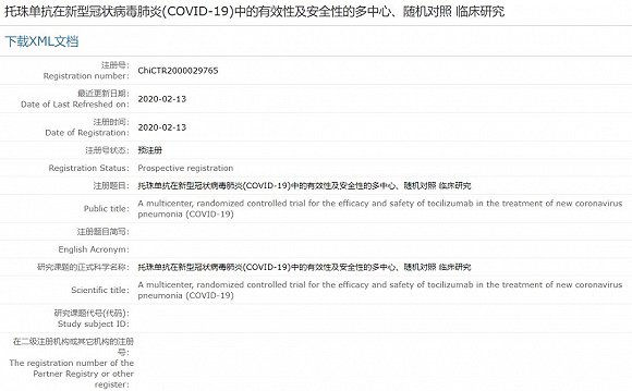 中国临床试验注册中心官网显示,由中国科学技术大学附属第一医院(安徽省立医院)发起的“托珠单抗在新型冠状病毒肺炎(COVID-19)中的有效性及安全性的多中心、随机对照临床研究”已预约登记。旨在评估托珠单抗治疗普通型NCP(含重症高危因素)及重型NCP患者的有效性和安全性。