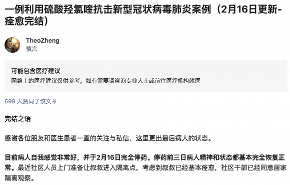 知乎用户“TheoZheng”在知乎上记载了已订婚女友的父亲近半个月来自行服用羟氯喹治疗的经历。患者于1月24日开始发病,随后几天持续发热、频发干咳,实验室血液鉴定结果和CT结果显示病症高度疑似新冠肺炎,后由于武汉当地收治能力不够只能进行居家隔离。