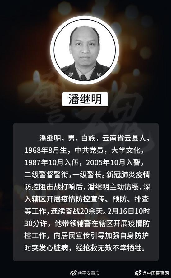 潘继明自2005年从部队转业参加公安工作以来,长期扎根基层一线,以强烈的事业心和责任感,全身心投入治安巡逻防控、道路交通管理和打击违法犯罪等工作,有力维护了社会稳定、确保了一方平安。他牢记宗旨、一心为民,带着对群众的深厚感情,主动深入走访了解社情民意,竭心尽力为群众排忧解难,先后妥善排查化解矛盾纠纷3400余起,赢得了辖区群众的普遍赞誉。新冠肺炎疫情发生后,他不顾自己刚做过心脏搭桥手术尚未完全康复,主动请缨参加疫情防控突击队,连续20余天奋战在一线,并冒着被病毒感染的风险,带头进入疑似病人家中排查,连夜护送确诊患者赴医院救治。2月16日上午,他在社区开展疫情防控工作时,因劳累过度突发心脏病,经抢救无效不幸牺牲,年仅51岁。