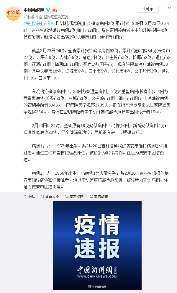 截至2月23日24时,全省累计报告确诊病例93例,累计治愈出院54例(长春市27例,四平市9例,吉林市5例,延边州4例,公主岭市3例,松原市2例,通化市2例,辽源市1例,梅河口市1例),死亡1例(四平市),现在院隔离治疗确诊病例38例。其中长春市18例,辽源市6例,四平市5例,通化市4例,公主岭市3例,延边州1例,白城市1例。