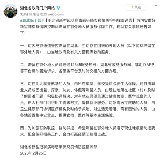 为切实做好新冠肺炎疫情防控期间滞留在鄂外地人员服务保障工作,现就有关事项通告如下: