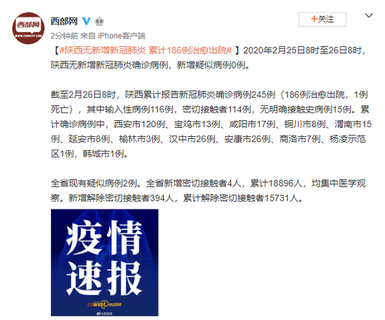 2020年2月25日8时至26日8时,陕西无新增新冠肺炎确诊病例,新增疑似病例0例。