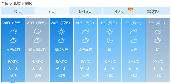 根据北京市气象台今早发布的最新预报,今天白天,北京晴转多云,北转南风2、3级,最高气温9℃;夜间,多云转阴,南风,1、2级,最低气温零下2℃。
