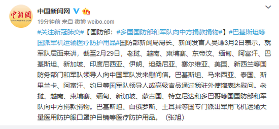 国防部新闻局局长、新闻发言人吴谦3月2日表示,就军队层面来讲,截至2月29日,老挝、越南、柬埔寨、东帝汶、缅甸、阿富汗、巴基斯坦、新加坡、印度尼西亚、伊朗、坦桑尼亚、塞尔维亚、美国、新西兰等国防务部门和军队领导人向中国军队发来慰问信。巴基斯坦、马来西亚、泰国、斯里兰卡、阿富汗、约旦等国军队领导人或高级官员通过我驻外使馆表达慰问。老挝、越南、柬埔寨、缅甸、新加坡、蒙古国、特立尼达和多巴哥等国国防部和军队向中方捐款捐物。巴基斯坦、白俄罗斯、土耳其等国专门派出军用飞机运输大量医用防护服口罩护目镜等医疗防护用品。(张旭)