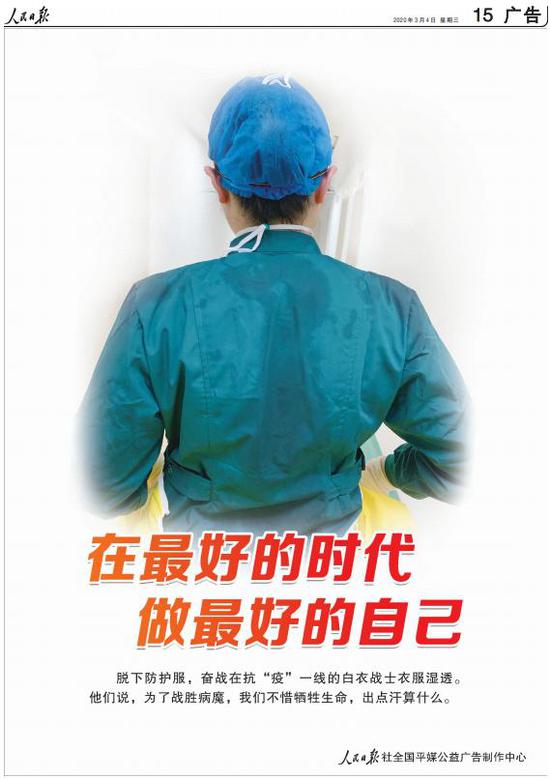 今天,一位白衣战士的背影登上了人民日报公益广告,占据了整个版面。只见她背对镜头,脱下防护服,汗水湿透了衣服。