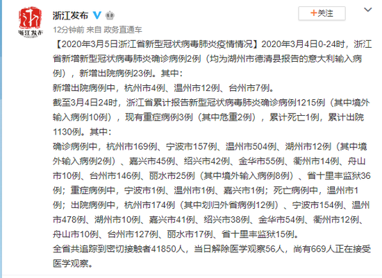 2020年3月4日0-24时,浙江省新增新型冠状病毒肺炎确诊病例2例(均为湖州市德清县报告的意大利输入病例),新增出院病例23例。其中: