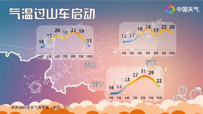 南方最高气温波动较大的省会级城市前三分别为,贵阳、南宁、福州。贵阳4日最高气温为10℃,未来震荡回升到24℃,然后受冷空气打压,降回11℃,标准的春季“过山车”走势。南宁4日16℃,8日将飙升至31℃,升温极猛。福州7日最高气温24℃,8日仅有17℃,降温幅度达7℃。