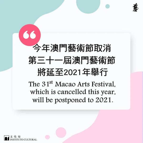 因新型冠状病毒疫情在全球扩散的影响,澳门文化局经审慎评估风险後,宣布取消原定在今年5月举行的第三十一届澳门艺术节。