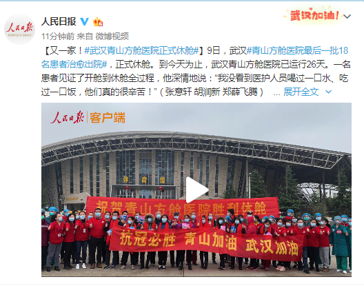 9日,武汉青山方舱医院最后一批18名患者治愈出院,正式休舱。到今天为止,武汉青山方舱医院已运行26天。一名患者见证了开舱到休舱全过程,他深情地说:“我没看到医护人员喝过一口水、吃过一口饭,他们真的很辛苦!”(张意轩 胡润新 郑薛飞腾)