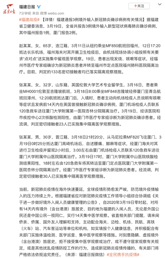 福建通报3例境外输入新冠肺炎确诊病例有关情况