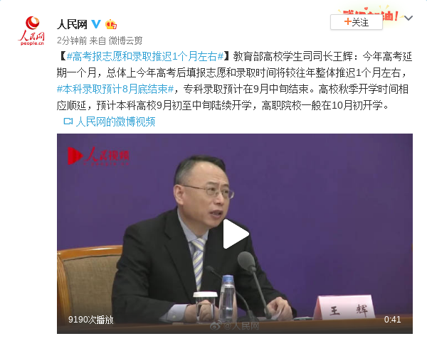 教育部高校学生司司长王辉:今年高考延期一个月,总体上今年高考后填报志愿和录取时间将较往年整体推迟1个月左右,#本科录取预计8月底结束#,专科录取预计在9月中旬结束。高校秋季开学时间相应顺延,预计本科高校9月初至中旬陆续开学,高职院校一般在10月初开学。