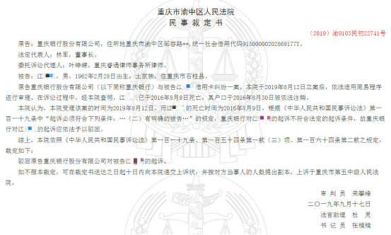 中国经济网北京12月5日讯 (记者 徐自立 马先震)伴随着信用制度的完善,信用卡越来越多的走进了人们的生活。在满足人们的消费需要的同时,也不可避免得使不少人因透支信用卡而有了一笔对银行的负债。因此,也不可避免的有人会因为各种原因没有及时偿还欠款而被银行追讨甚至起诉。近日,中国裁判文书网就披露了一起诉讼,重庆银行股份有限公司(以下简称“重庆银行”,BCQ,01963.HK)起诉了一名欠款未还的信用卡用户,不过,令人惊奇的是这位被告却被查明已经去世3年多。