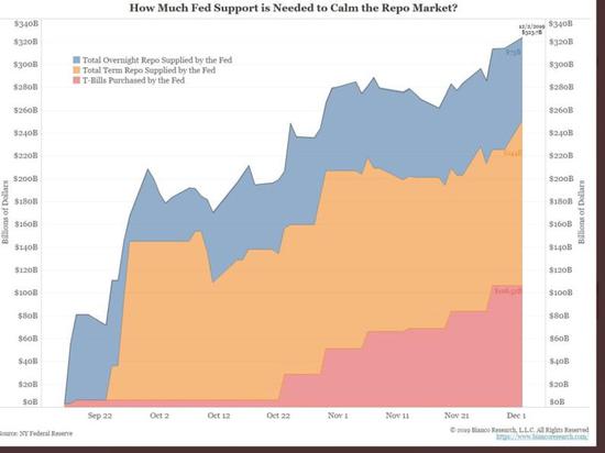 9月17日以来,美联储提供了超过3200亿美元的流动性以支持回购市场。但芝加哥Bianco Research创始人James Bianco表示,这不是一个长久的方案。随着日常业务的扩展,长期贷款的引入以及通过每月购买国库券来扩大资产负债表,美联储的投入越来越大,却不能当市场自动调整。“我认为美联储希望市场能够神奇地自我修复。我不知道为什么会这样。”