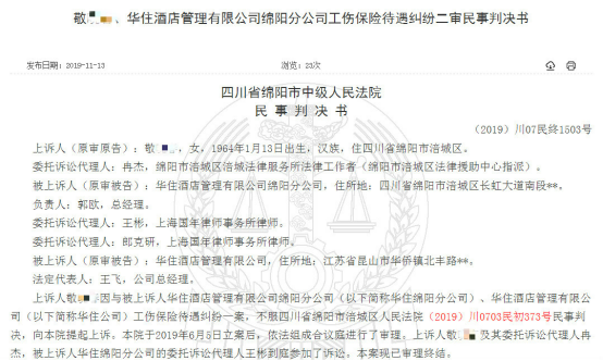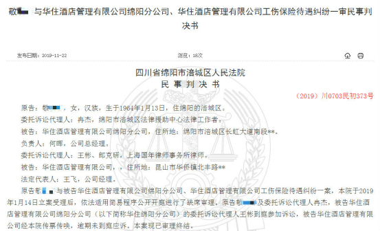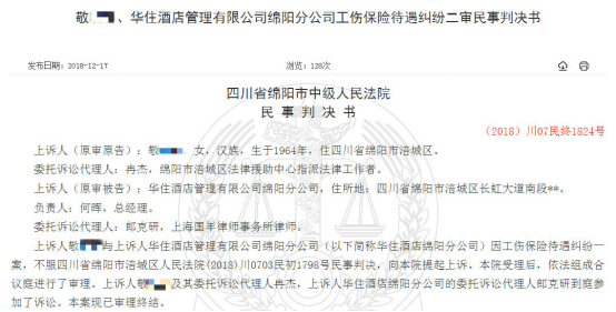 但除了卫生、消防等方面存在问题外,华住集团近日又曝出安全事故,其员工因工伤多次起诉华住集团。2019年11月,中国裁判文书网公布了该案一审判决四川省绵阳市涪城区人民法院民事判决书((2019)川0703民初373号)和二审判决四川省绵阳市中级人民法院民事判决书((2019)川07民终1503号)。具体内容如下: