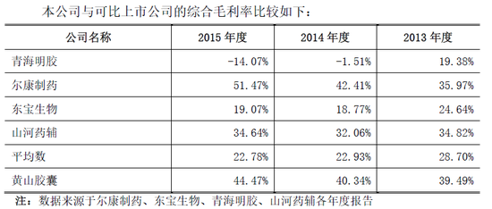 上市后,黄山胶囊毛利率逐年下降,公司解释整体水平与上市公司山河药辅趋近。但如果与上市前公司披露的综合毛利率相比,差异就十分明显了。上市前,黄山胶囊毛利率明显高于上市公司平均数,逐年上涨,且远远高于山河药辅、东宝生物,具体如下: