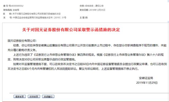 国元证券收警示函 三年前IPO尽职调查程序不规范
