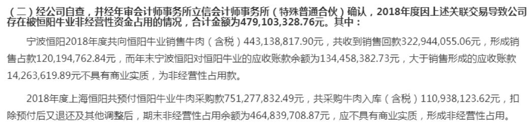 今年4月,因存在被第一大股东的关联企业恒阳牛业占用资金的情形,公司股票被实施其他风险警示。此后,公司2018年年报被出具无法表示意见的审计报告,深交所对公司股票交易实行“退市风险警示”。