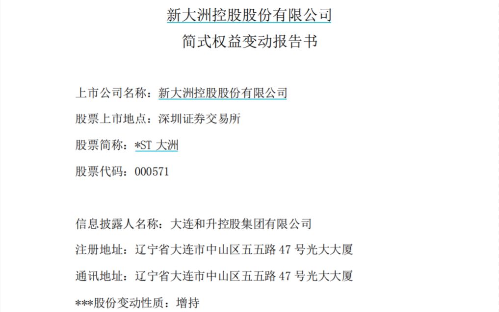 *ST大洲(维权)12月9日晚间发布公告称,大连和升控股于9月2日至12月6日在二级市场累计买入4070.27万股公司股份,占总股本的5%。
