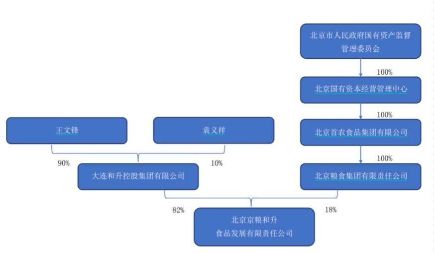 股权关系显示,大连和升控股、北京粮食集团分别持有北京京粮和升82%、18%股份。大连和升控股的控制人是王文锋,北京粮食集团是北京首农食品集团的全资子公司,最终控制方是北京国资委。