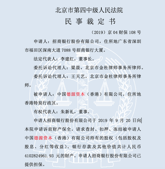 根据裁定书,招商银行曾于2019年9月20日向法院申请诉前财产保全,请求查封、扣押、冻结德源资本持有的股权、银行存款及其他价值共计人民币41.03亿元财产。