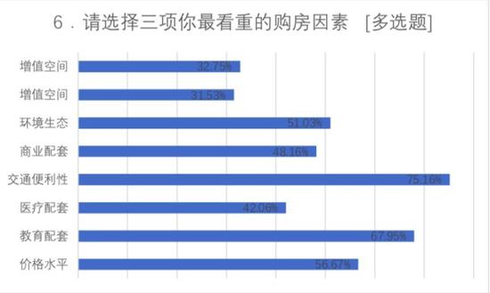 在价格水平、教育配套、医疗配套、交通便利性、商业配套、环境生态、增值空间、开发商品牌等影响购房因素中,价格竟然不是首要考量因素,受访者最看重的是交通便利性。