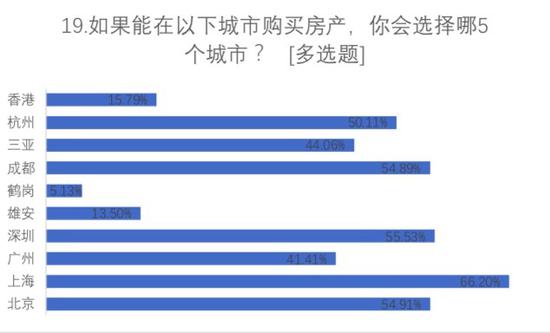问卷列举了包括北京、成都、鹤岗在内的全国10座一、二、三线热点城市。《报告》现实,北京、上海、深圳依旧是最受欢迎的城市,66.2%的受访者希望在上海购房,为全国最高;深圳以55.53%位列第二,北京以54.91%排名第三。成都以54.89%位列第4,成为最受欢迎的新一线城市,紧随其后的是杭州50.11%。