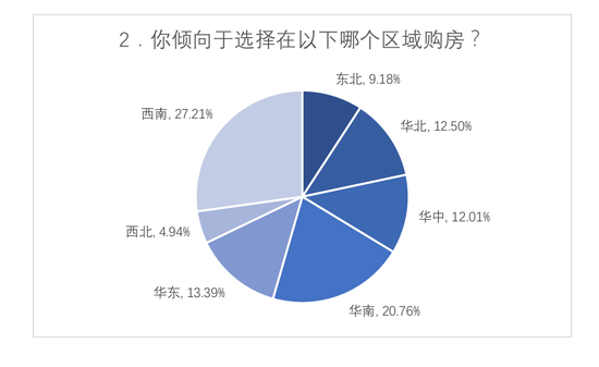 按区域划分,温暖安逸的西南成了全国最受欢迎区域,有27.21%的受访者希望在该区域购房;华南的购房者偏向程度为20.76%,位列第二;其余区域的整体倾向在9%~14%之间,差别不大;选择西北的受访者仅有4.94%。