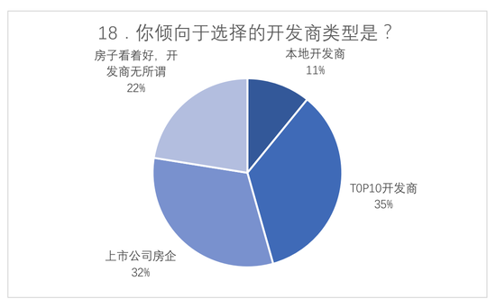 受访者对于房企的实力有着相当大的认同度。34.77%的购房人倾向选择T0P10开发商,另有31.91%的购房者选择上市房企,本地开发商的选择比例仅10.85%。这在一定程度上解释了房地产行业越来越高的集中度,将来留给中小型开发商的空间会越来小。