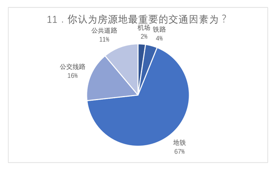 地铁是最受欢迎的交通方式,67.17%的受访者认为这是房源最为重要的交通因素,并且最好距地铁站的距离处于500米~1公里之间。其次是公交线路,为15.66%;也有11.1%的人认为房源地只要连通公共道路便可接受。