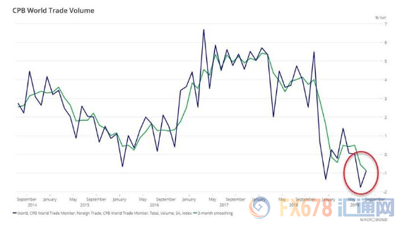 尽管CPB最新公布的全球贸易量在7月从6月的-1.7%回升至-0.8%,但是考虑到三个月的移动平均线明显的下行走势意味着这波反弹可能是暂时的。