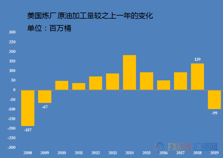 根据美国能源信息署的数据,自2008至2009年经济衰退以来,今年以来的原油加工量首次出现下降。