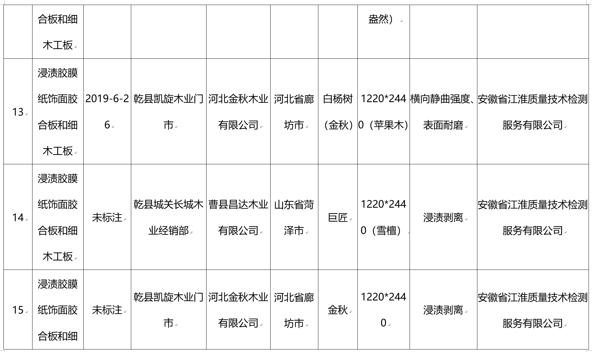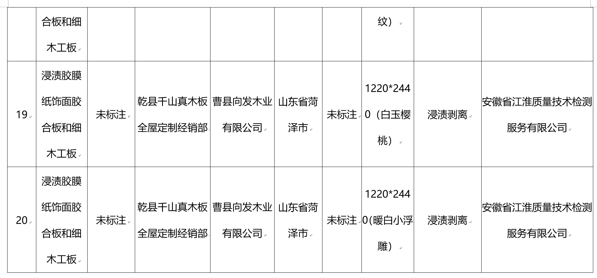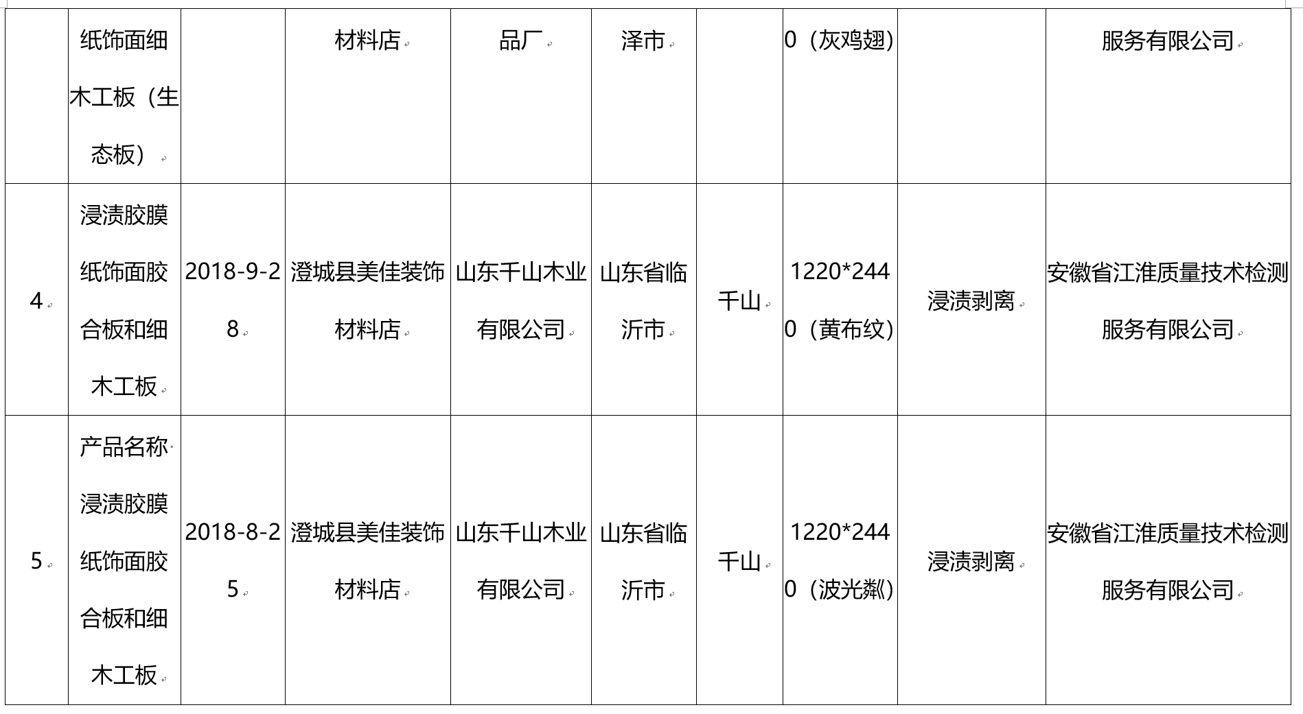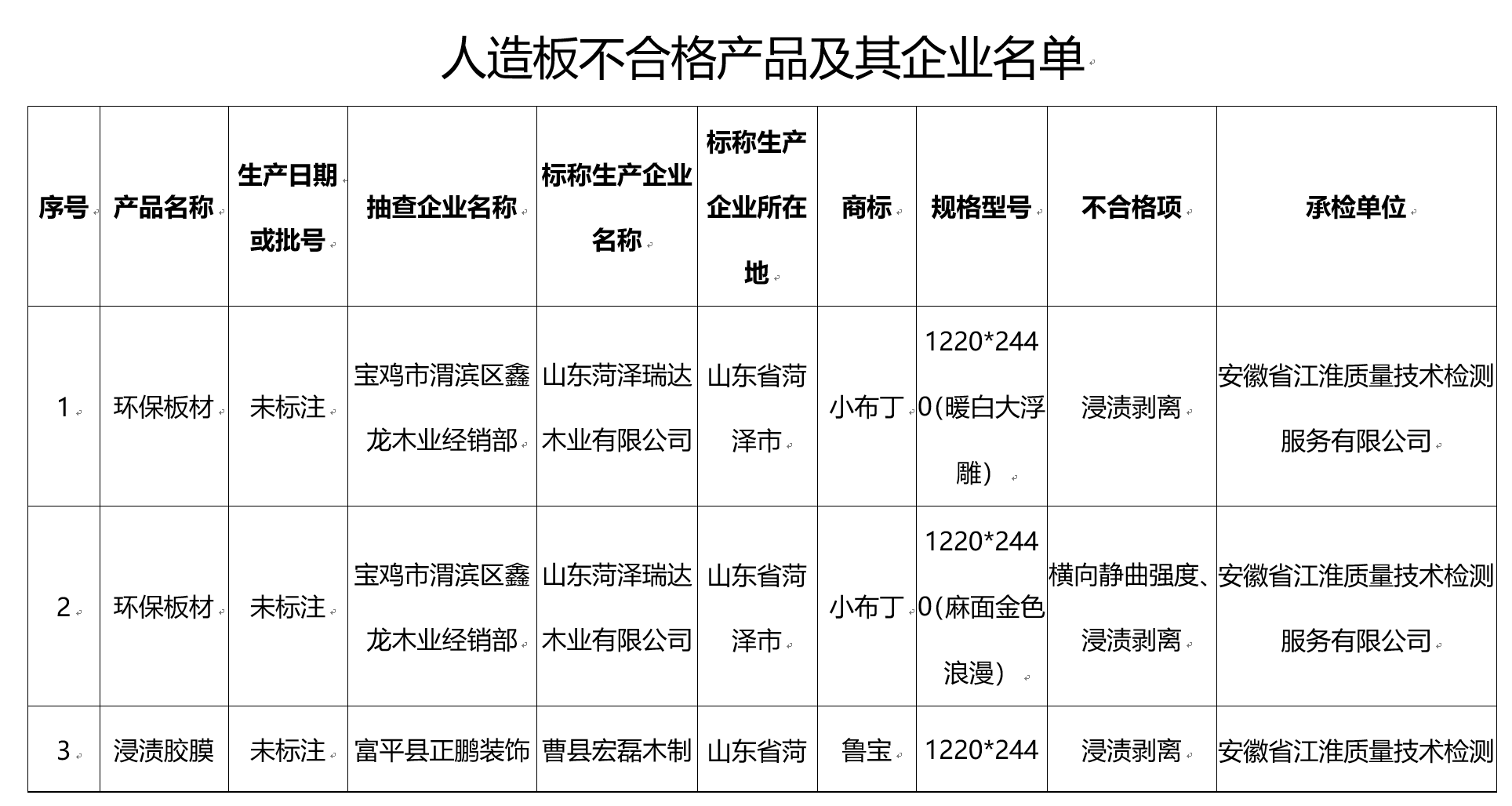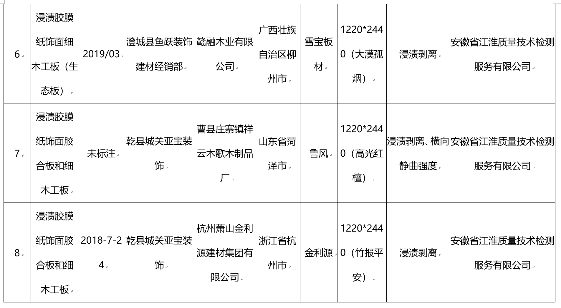 记者了解到,本次不合格样品商标包括小布丁、鲁宝、千山、雪宝板材、鲁风、金利源等。其中,有2款商标为小布丁的环保板材不合格,不合格原因分别为浸渍剥离和横向静曲强度。3款商标为千山的产品不合格,不合格项目分别涉及到浸渍剥离和表面耐磨。2款商标为三千方的浸渍胶膜纸饰面胶合板和细木工板不合格,不合格原因分别为浸渍剥离、含水率、表面耐磨等。