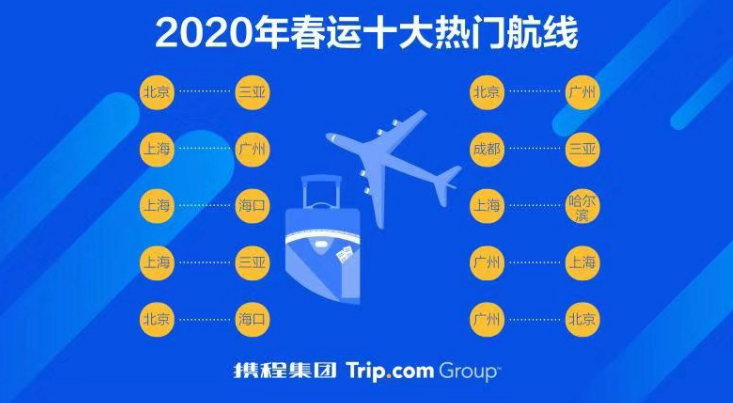 《报告》还指出,除了返乡团聚外,旅游过年正成为越来越多家庭的新选择。数据显示,2020年春运十大热门航线中,有5条都是飞往海南,前往三亚、海口避寒旅游已成人们过年的新潮流。前往三亚及海口旅游过年的旅客,近四成来自北京、江苏、浙江、上海等地。