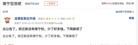 12月13日晚,南宁百货公告提示“近期有多家媒体报道对公司持有的物业征收情况及价值进行多方猜测,经公司了解,目前公司南楼房屋已从原有的拆迁范围内划出,因此我公司无法获得征拆补偿”。