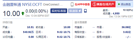 金融壹账通发行股票代码为OCFT,当天首次公开发行3120万股美国存托股票(ADS),对公众的价格为每股10.00美元。