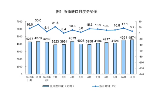 11月份,原油进口4574万吨,比上月增加23万吨,同比增长6.7%,增速比上月回落10.4个百分点。1—11月份,原油进口46188万吨,同比增长10.5%。