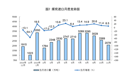 11月份,煤炭进口2078万吨,同比增长8.5%,增速比上月回落2.9个百分点。1—11月份,煤炭进口2.99亿吨,同比增长10.2%。