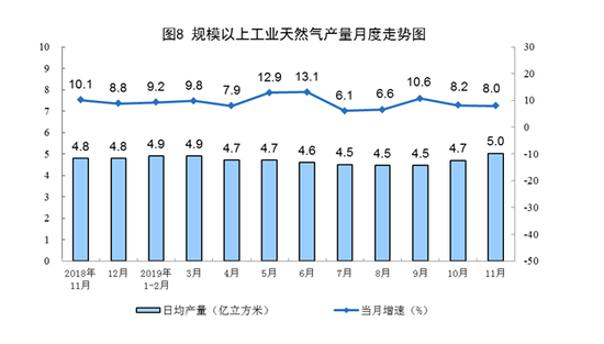 11月份,规模以上工业原煤、原油生产有所加快,天然气生产保持较快增长,电力生产平稳增长。
