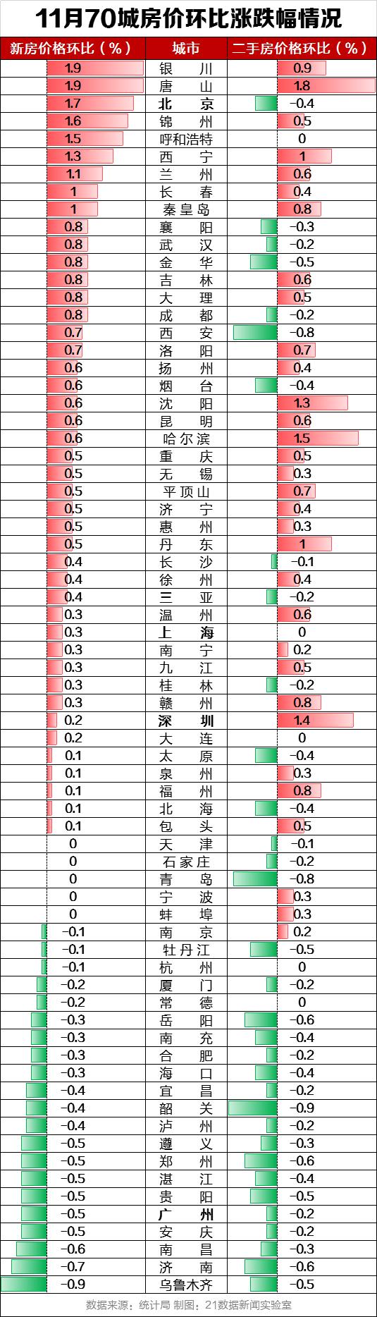 11月16日,国家统计局公布11月70城房价数据。环比方面,一线城市新房和二手房各有涨跌,二三线城市涨幅与上月相同或回落;同比方面,一线城市新房和二手房同比涨幅略有扩大,二三线城市涨幅分别连续7个月和8个月相同或回落。