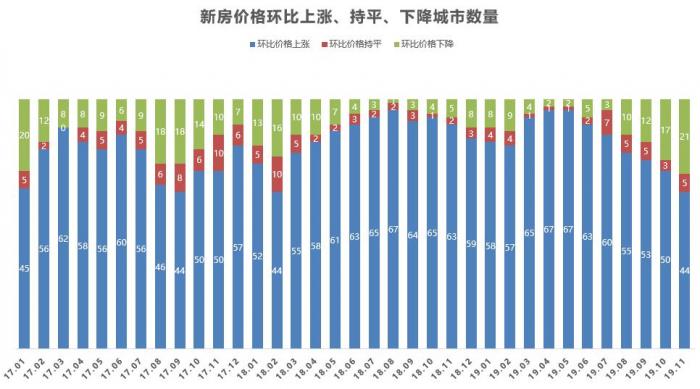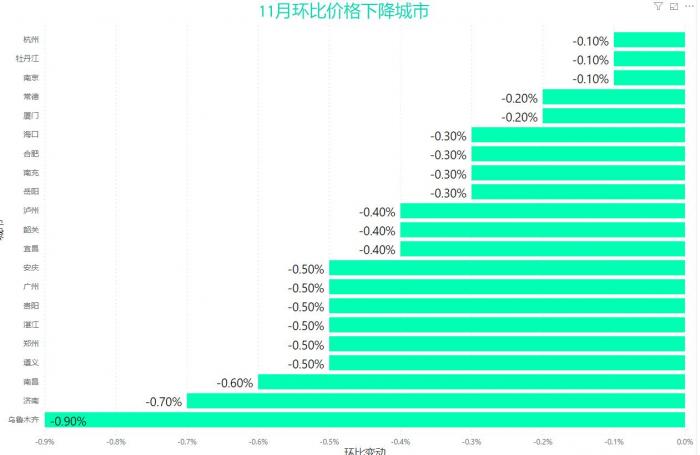 从房价上涨和下跌的城市数量看,房价上涨的城市数量为44个,相比10月份的50个呈现减少的态势。而降价的城市数量上升到了21个。