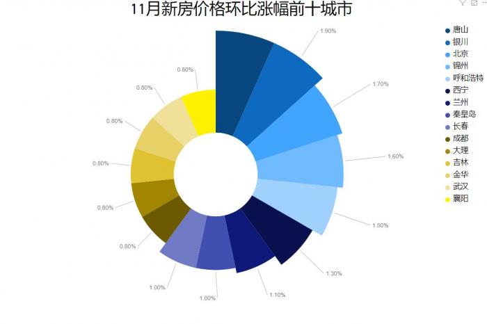 而从价格上涨城市来看,主要是唐山、银川、锦州、呼和浩特等三线城市为主。值得关注的是北京,11月北京新房价格环比上涨1.7%,这是北京2016年“930”调控开启以来的新高。